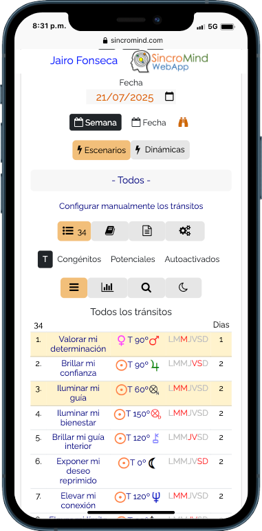 Desde que uso SincroMind WebApp, identificar mis tránsitos personalizados es instantáneo. Accedo desde mi celular o computadora y siempre sé cuándo se activan mis aspectos natales. Ha revolucionado mi forma de aplicar la astrología en el día a día. ¡Totalmente recomendada!